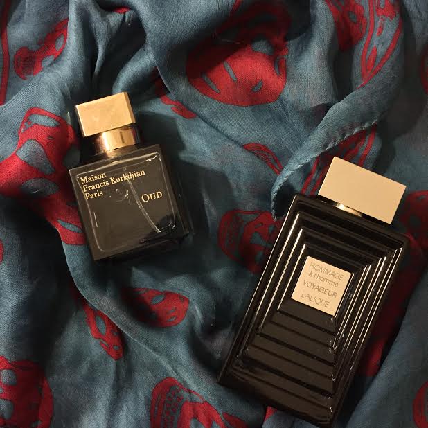 My silk skull scarf is my fail safe. It’s so wonderfully versatile that I can pair it with a smart work shirt and trousers, a leather jacket, or even a white t-shirt and jeans. It can also be worn in a million different ways – looped around the neck front of neck numerous times, simply draped around the back of the neck or tied like a snood – it is anything, if not multi-functional. It makes complete sense then, that this scarf would perfectly match the blue tones of my fail safe fragrance – OUD by Maison Francis Kurkdjian.