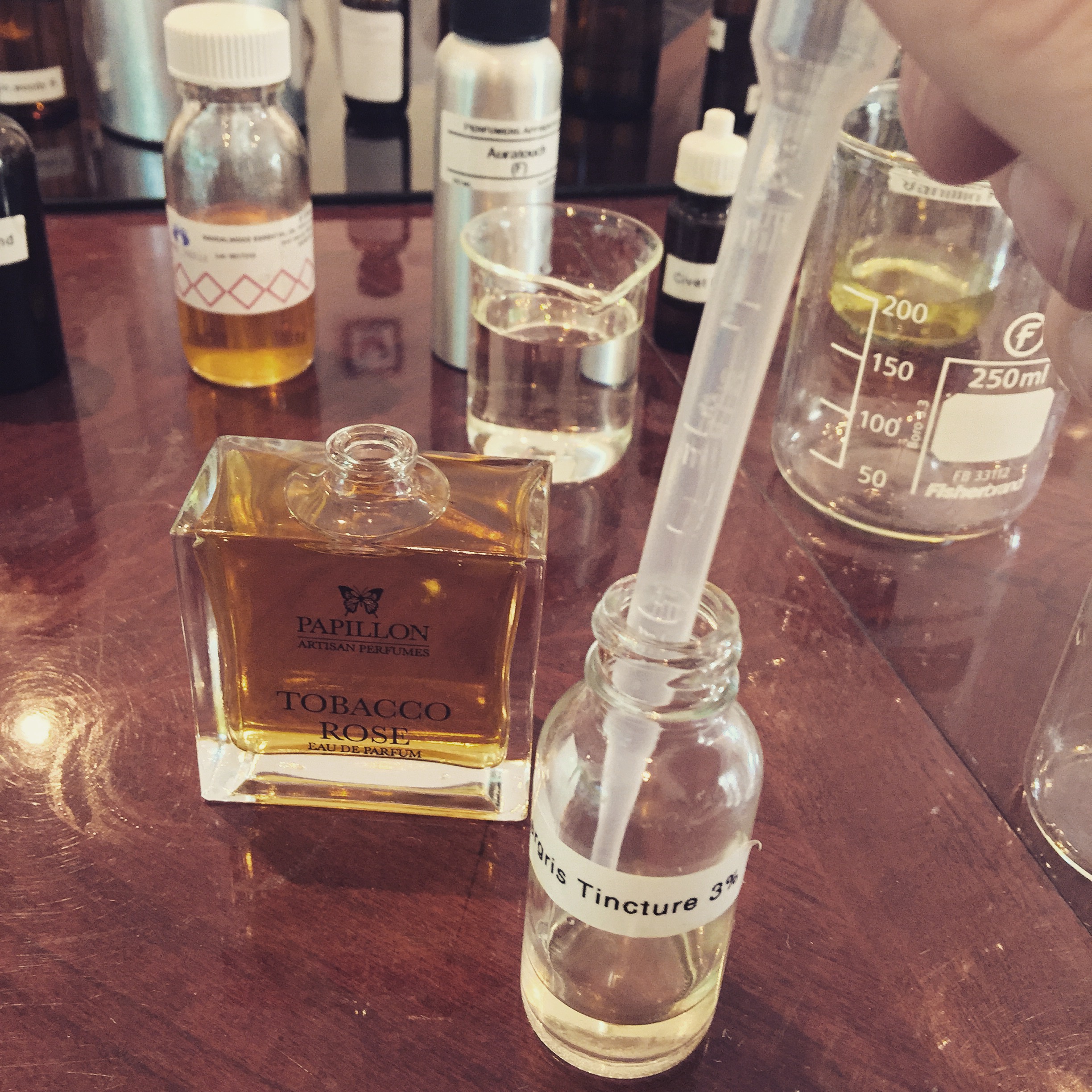 I am tasked with mixing up a batch of ‘Papillon Musk’, the musk accord used in Tobacco Rose. Liz composed this accord after a musk she had been using stopped being commercially available and it’s a soft, velvety blend with a real funky animalic kick. So, a bit tentatively I set to work, precisely measuring out the ingredients to make a batch of Papillon Musk. At each stage I stop and sniff the materials in isolation. The castoreum blend is dirty but also comforting whilst the Auratouch is soft and supple, with an almost fruity edge, and the vanillin is gorgeously delectable.