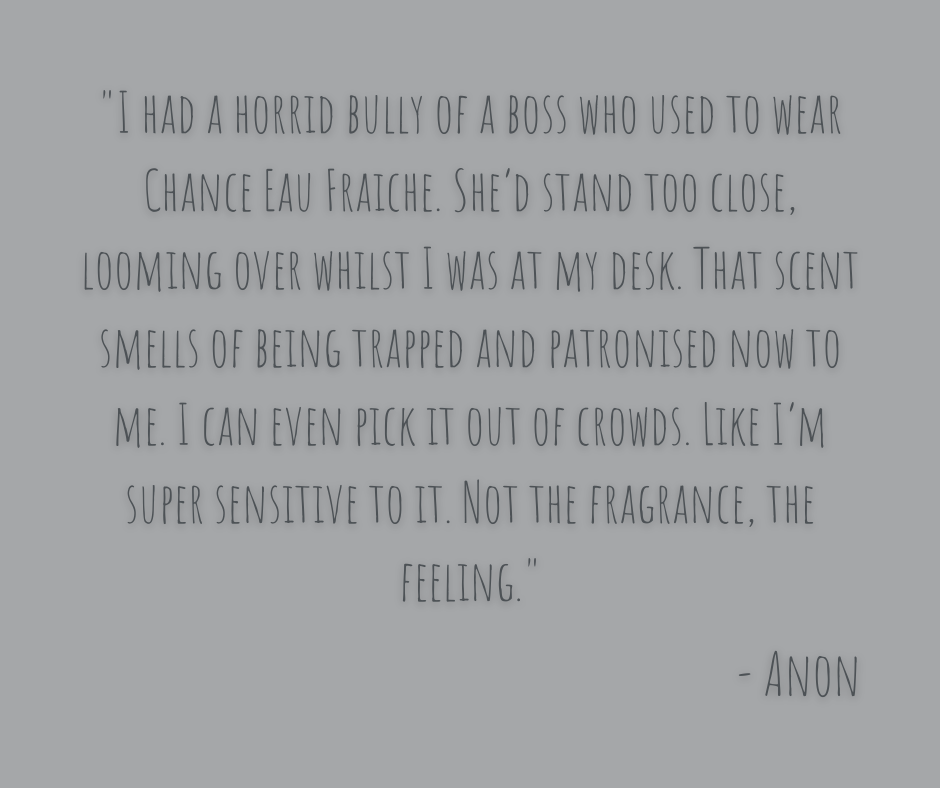 A scent memory is an olfactory time capsule and sometimes, when you open it up, there’s nothing good to be found inside, only danger and decay. For me, it can be a mask to hide a reality too difficult to face however, for others it can be an uninvited trigger that takes them back to a place they don’t want to go. My experience of scent and memory is unique to me but I am far from alone in dealing with olfactory triggers that unearth dark and unpleasant feelings. I asked readers to share their negative scent memories and have included a handful throughout this piece. To protect their identities, I have not disclosed their names.
